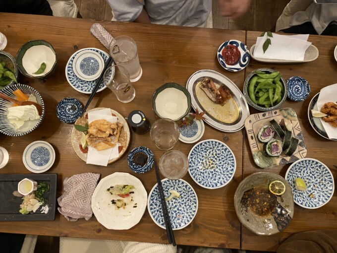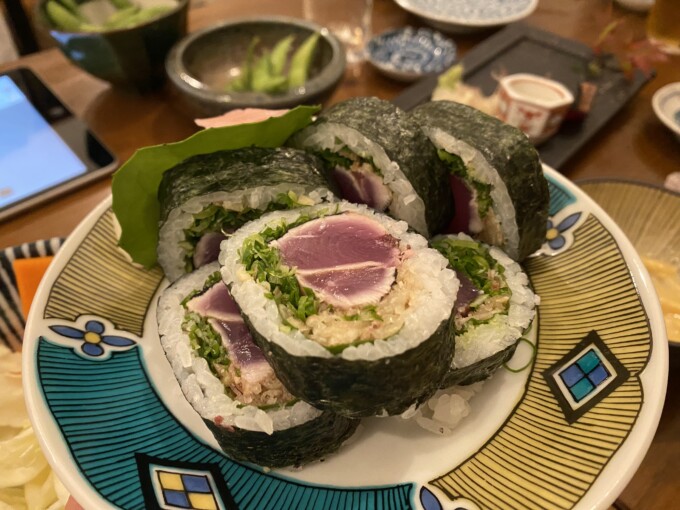 テーブルにたくさん食べ物がある時に撮らずにこれほぼ帰る直前の土佐巻とかさきいかの天ぷらをこれ最後にしよう!って追加で頼んだ時の一番からっぽの時に写真。食べるのと喋るのに夢中でついつい忘れてしまうよね。