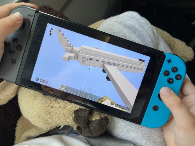 わたしは窮屈だっていいながら飛行中爆睡しちゃってて、フィオンは横でおりこうにしているなぁと思ったらマイクラで飛行機作ってたよ!これ中にもちゃんと座席もあってちゃんとできてるの。上手!上手!