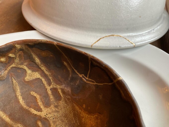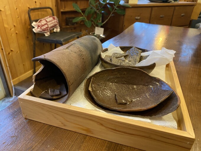 わたしはもしもこんな機会があったら直したい!って思っていた器をとっておいたんだけど、ゆなちゃんはなかったから実家に行ってお父さんの割れたの預かってきたよ。お父さんは自分で漆で金継を時々しているみたいで溜まったらやろうと思っていたやつみたい。