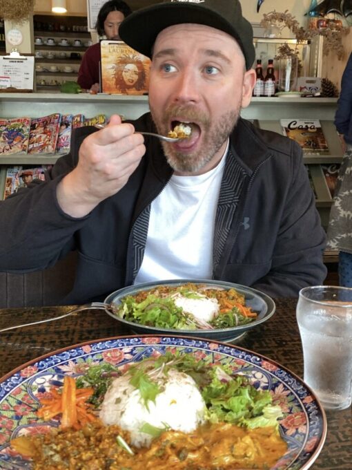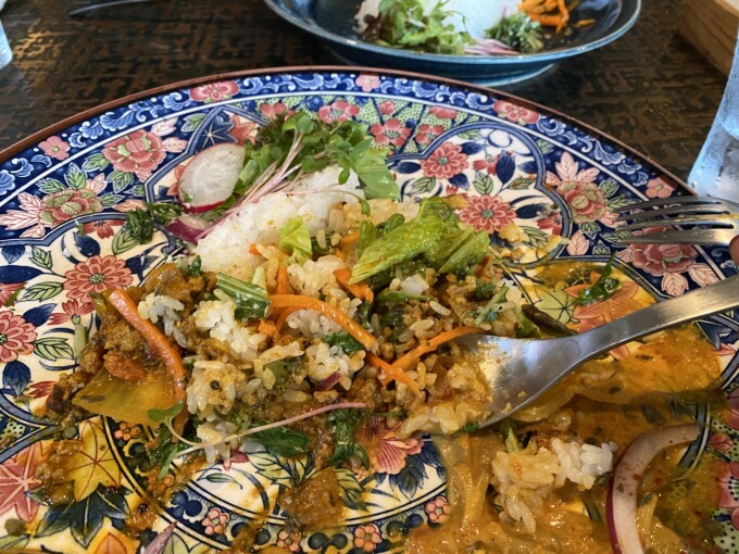 最初はもちろん普通にカレーをそれぞれ味わうんだけど途中からカレーだけを混ぜたりその後は副菜のお野菜を混ぜたりするとたくさん味変できるし、それぞれがほんとにおいしいの!!!エメちゃんとサラダ食べた時にこのドレッシングおいしいね!って言ってたんだけど、『自家製ゆのす』って書いてあったから今調べてみたら『ゆのす』ってゆの酢って言って100%ストレートのゆず果汁なんだって。めちゃめちゃカレーとあっておいしかったよ。