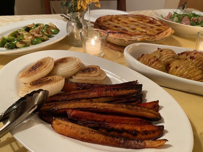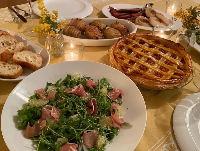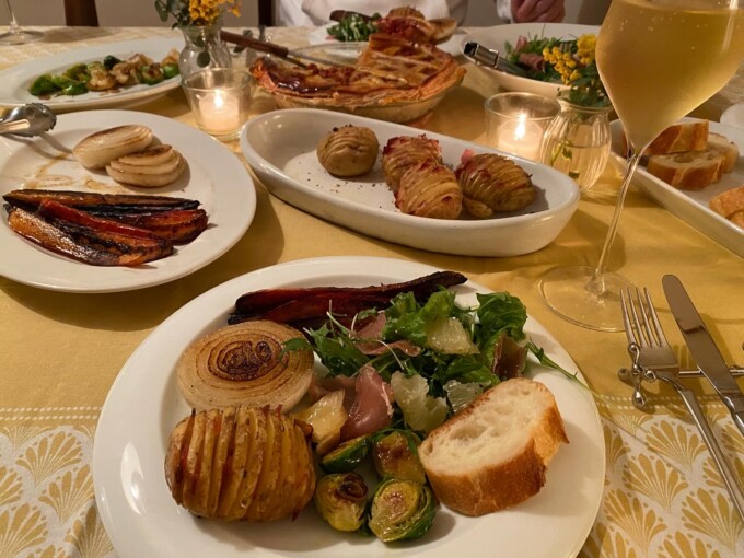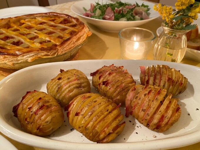 メニューはね、春っぽくしたかったからもうスーパーでは売り始めてる新じゃがでハッセルバック、後ろに見えるのはいつもバレンタインにリクエストされるミートパイだけど中のクロスのパイ部分はたぶん中の具の油すちゃって膨らまなかったぁ残念。