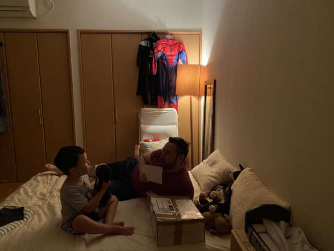 ベッドルームで休んでたエメのところに持って行って「Daddy! Here you are!!」って。