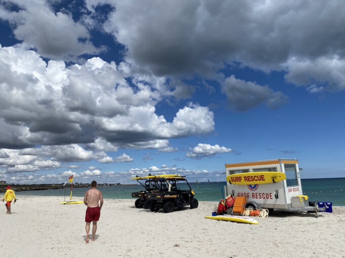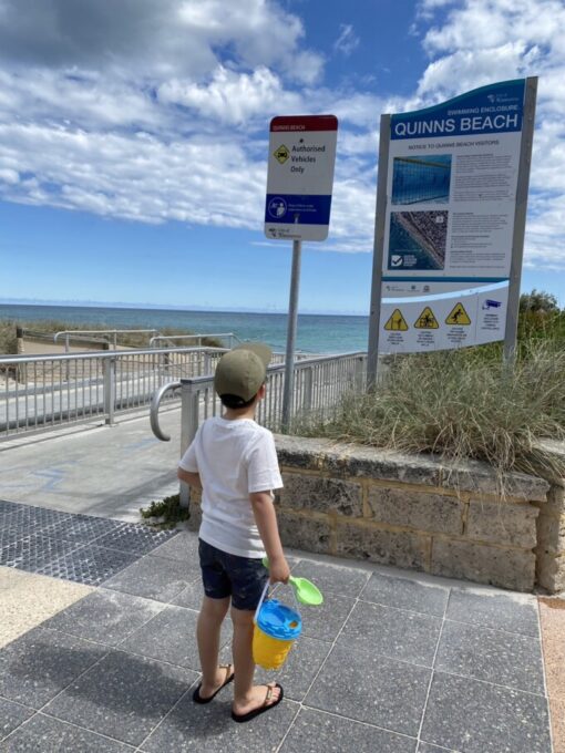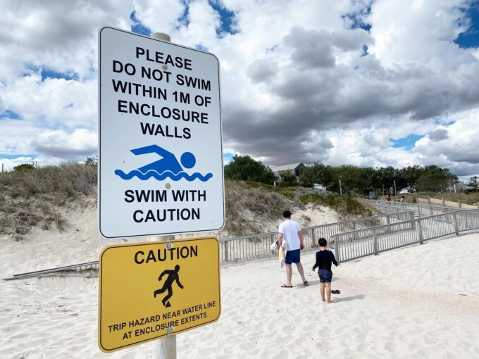 この↑看板の上の写真わかるかな?ネットがあるビーチなの。なぜかというとパースって結構シャークアタックがあるのよ。