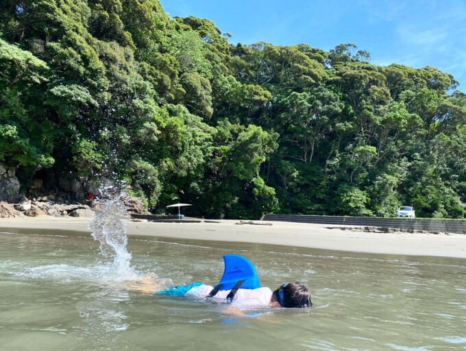 Thanks to his swimming lessons, he can now swim using a flutter kick without taking a breath. He really feels like a shark now! However, when he watched the video later, he seemed slightly disappointed (apparently, he thought the shark fin would be visible on his back).