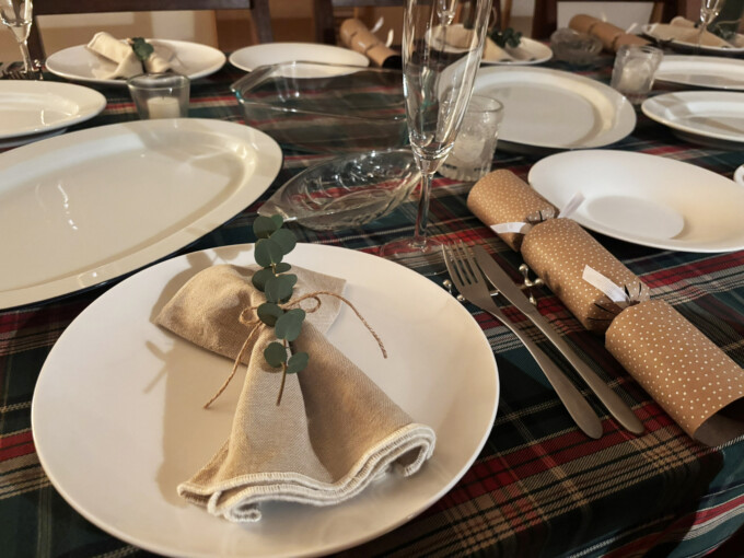 そこからフィオンの寝る準備して色々終わらせてフィオンが寝た11時過ぎからまずはプレゼントのラッピングして、そこからテーブルセッティングよー。なのにこの時間小田和正のクリスマスの約束がはじまっちゃって手が止まるとまる。1時過ぎにやっと完成。今年は今までやってそうでやってなかったクリスマスカラーのタータンチェックのクロス。かわえー