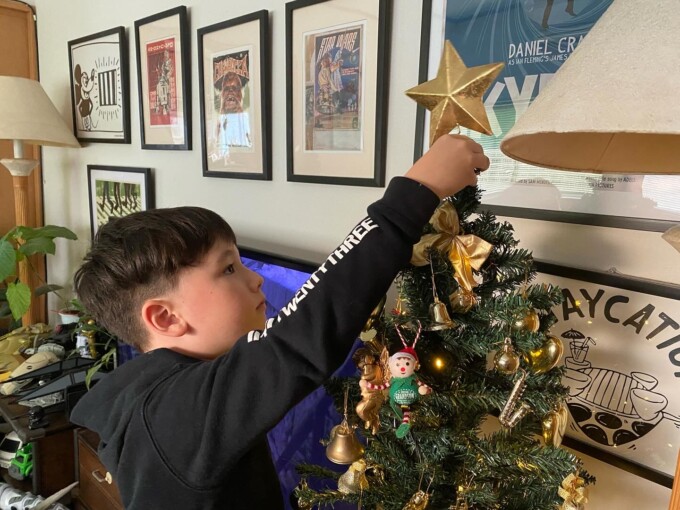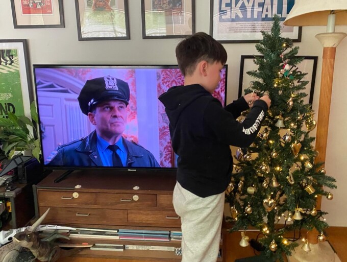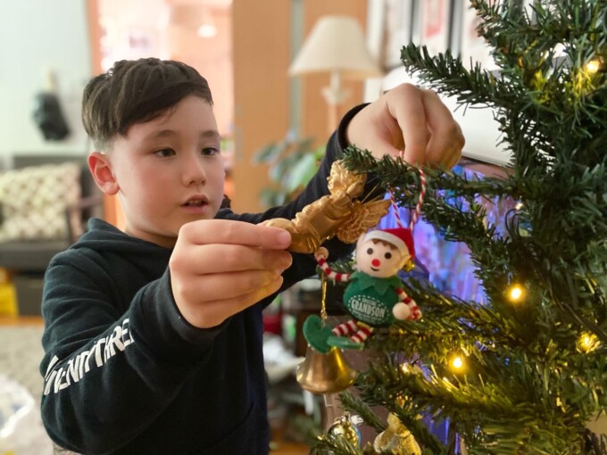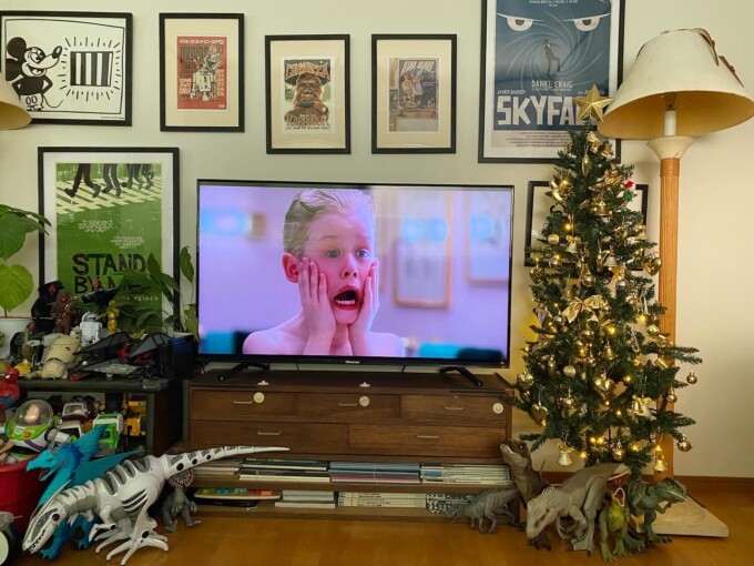 足元にはフィオンお提案でダイナソーが並びました。そして飾り付けしている間はクリスマスムービーつけておこう!っていつも言うんだけど、ここ3年くらい毎回ホームアローン選ばれるよ。バトラー家大好きなシーズン来たわ!