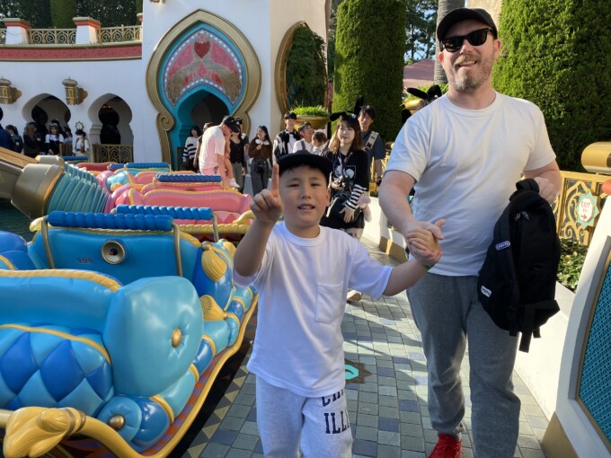 これはフライングカーペット!あまりにも楽しくて「もう1回!」って言ってるところ。この後そのまま最後尾に並んでこれは2回乗ったよw