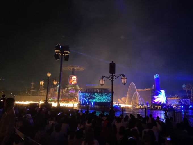 ちょうどトイストーリーが終わったのが8時前くらいだったから7時半からやっていたショーのクライマックスですんごい人だったからまともに見れなかったけど、花火や水やプロジェクションマッピングと音楽ですんごかったよ!!!