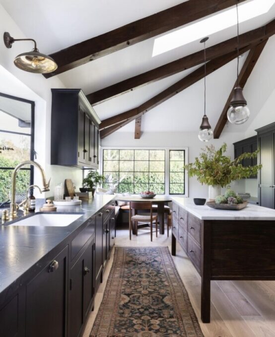 だからキッチンを結構ダークな色でもいいかなぁと。それで壁は絶対白で天井の梁も濃い色が締まってかっこいいかなぁと。