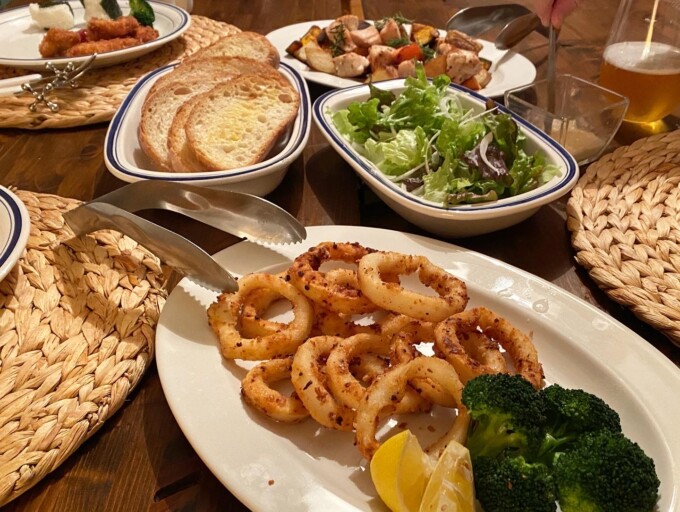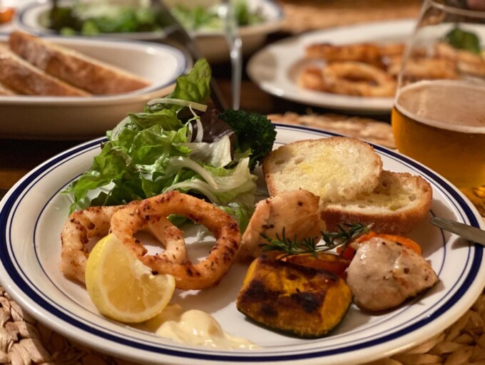 カラマリと、チキンとお野菜のグリルがご希望だったのでそれにサラダを付け加えました。