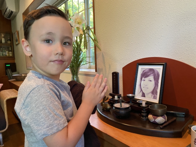 フィオンくんもいろいろと意味がわかってきたから、まりちゃんにお線香して大好きチンチーンして