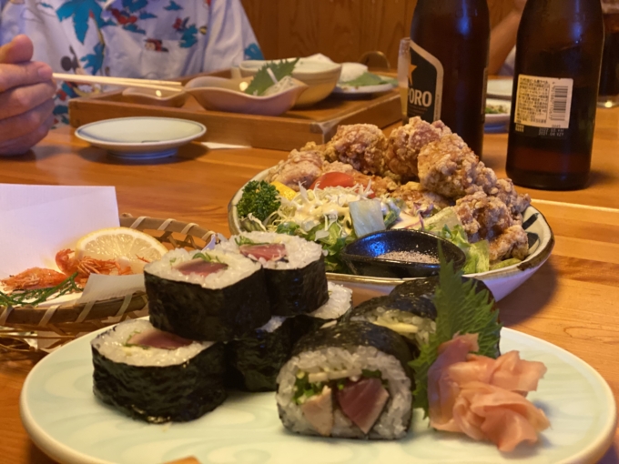 (わたしはダイエット中だから飲まず、炭水化物もこの土佐巻2個だけ!その代わりお昼はサラダだけ)