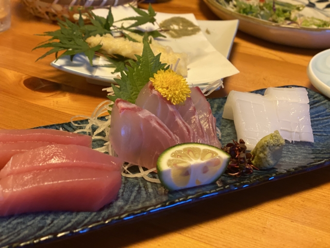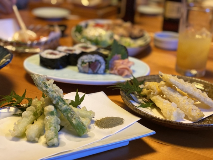 お刺身の盛り合わせや、コーン、アスパラの天ぷらなどなど。