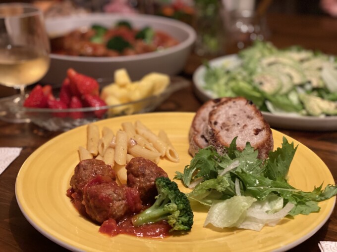 ミートボールにペンネカルボナーラにウェッジとサラダ。