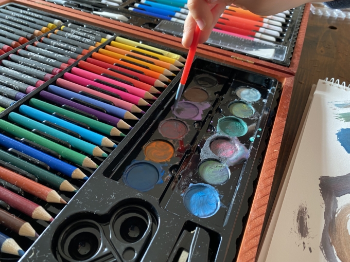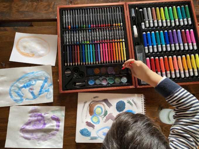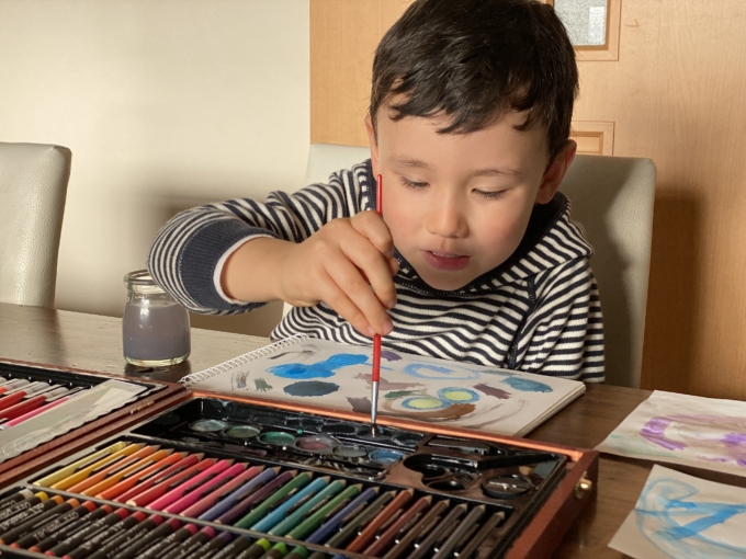 最初だけお水をつけて少し絵の具を溶かして描くんだよって教えただけで自由にさせたら