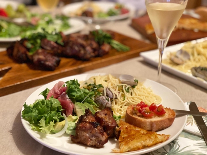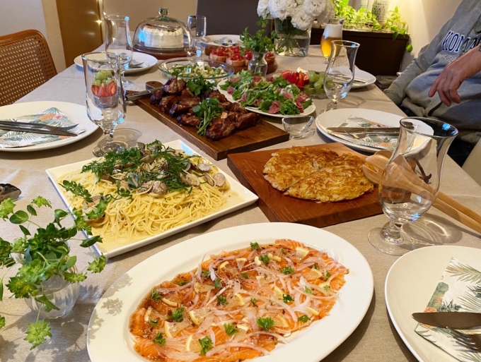 サーモンのカルパッチョ、ボンゴレビアンコ、姪っ子ちゃん甥っ子ちゃん大好きスペアリブ