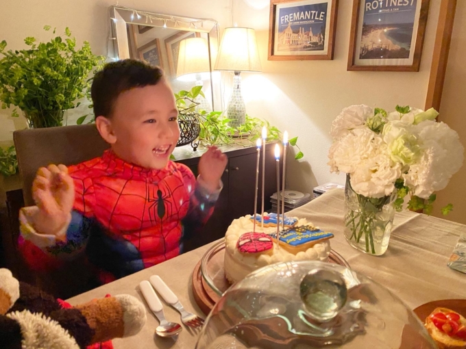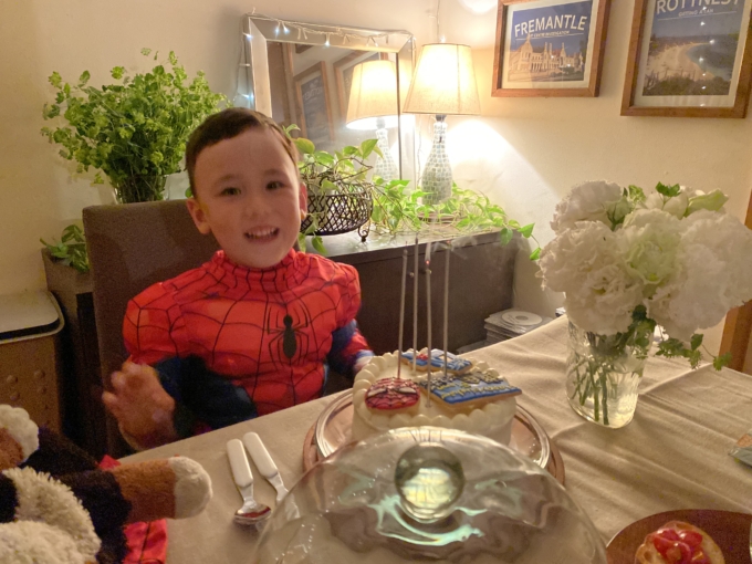 この日ももちろんスパイダーマン。ケーキもスパイダーマンw