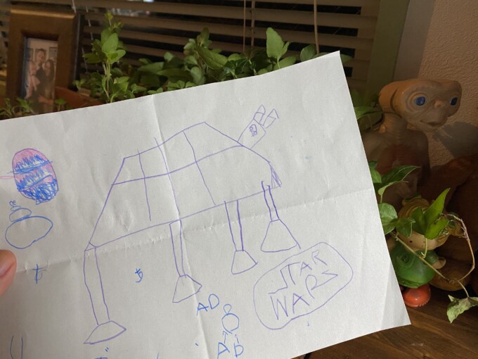 それで納得!前に幼稚園から持って帰った落書きにスターウォーズのロゴがあったんだけど