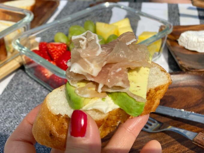 前日の夜にディナーから帰ったらワインと一緒にと思って買っていたフルーツやチーズや生ハムが