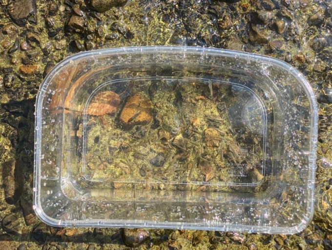 見えるかなぁ?これでも途中だから最終的にはすんごい量のめだかを2人でつかまえてたよ。