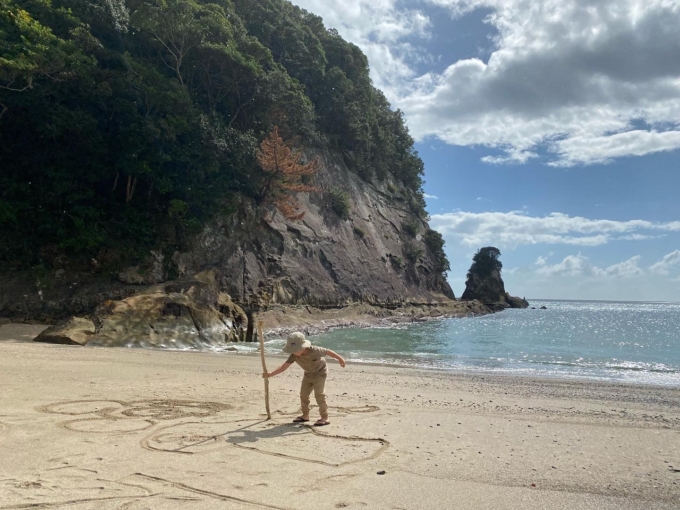 ジョーンズさんはこの日もビーチでせっせとお絵かき。