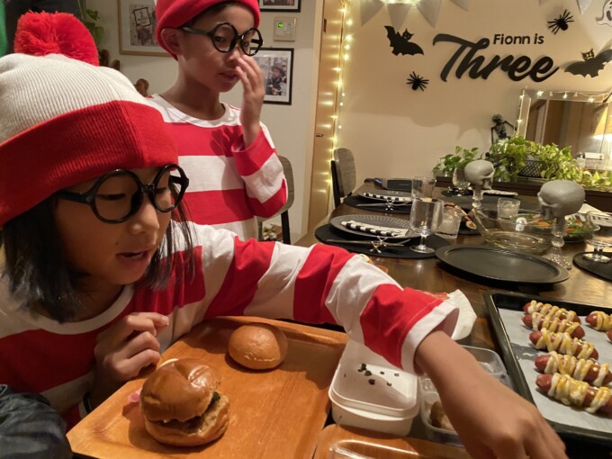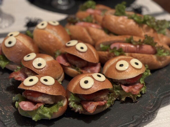 そしてバトラー家のハロウィンと言えばこれはかかせない、ベロベロハンバーガーとソーセージが指になってるホットドッグ。昔はそれぞれバラバラで容器に入れて並べておいてこどもたちが思い思いのオバケを作るってやってたけど、もう今年からわたしがまとめて作りましたw