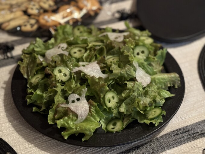 今年はサラダはにんじんのジャックオーランタンじゃなくてきゅうりでガイコツにしてみたよ