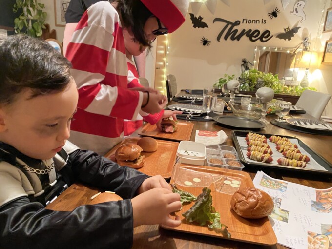 そしてバトラー家のハロウィンと言えばこれはかかせない、ベロベロハンバーガーとソーセージが指になってるホットドッグ。昔はそれぞれバラバラで容器に入れて並べておいてこどもたちが思い思いのオバケを作るってやってたけど、もう今年からわたしがまとめて作りましたw