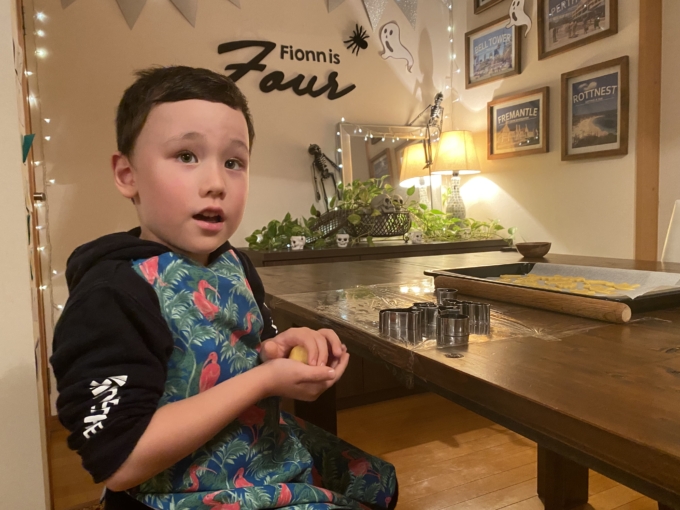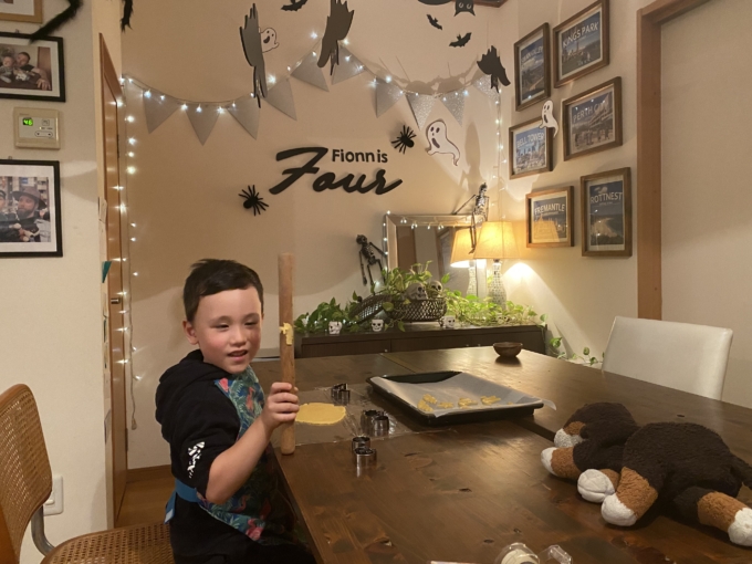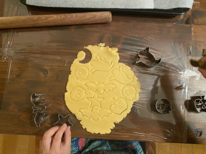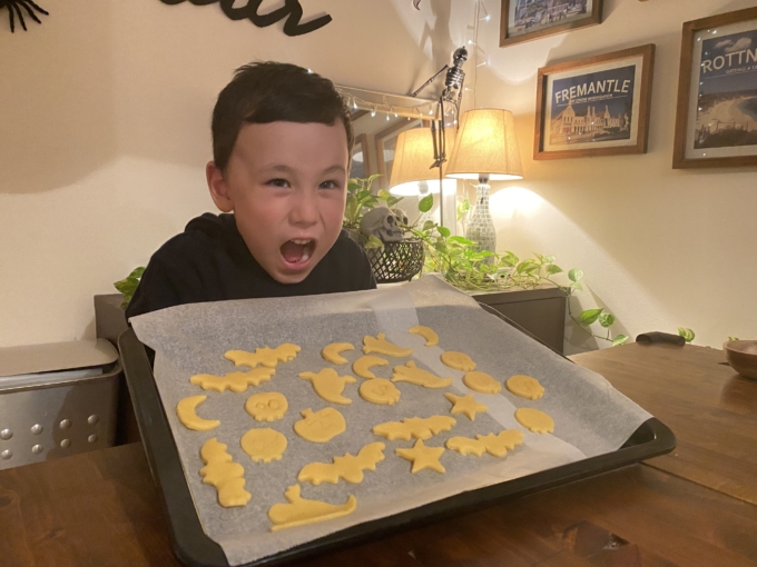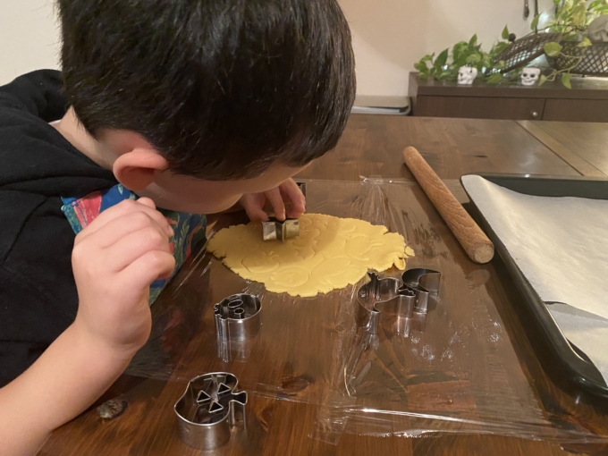 明日は家族でハロウィンパーティーなので、毎年恒例の前日クッキー作りをしたよ。