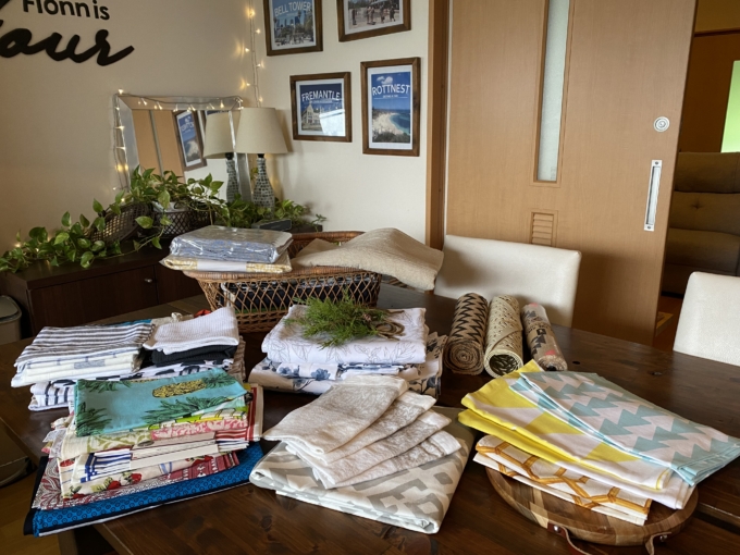 テーブルクロスやナプキンや布製のランチョンマットだけでもこんなにあるよ。
