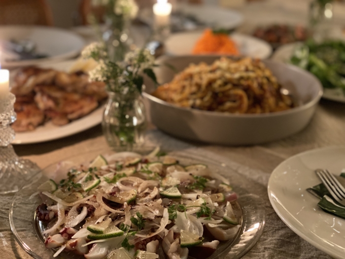 タコとタイのカルパッチョに、マニマニさんのパン、ジャガイモとさつまいものグリル。