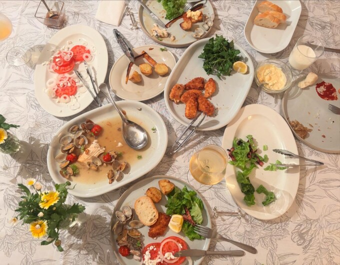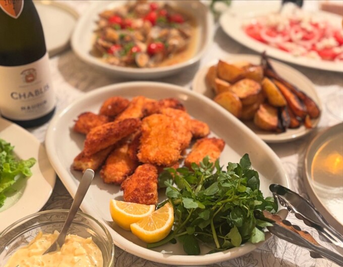 ちなみに今回のメインメニューのチキンカツ&タルタルソースのチキンはお買い得品で、真鯛のアクアパッツァの真鯛は半額だったやつ!それに、頂き物のトマトと新玉ねぎにカッテージチーズで作ったサラダにははちみつ入れたドレッシング作ってかけたらめっちゃおいしかった!グリルしたお野菜はJAで買ったやつね。