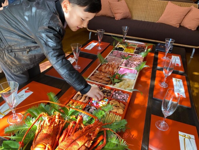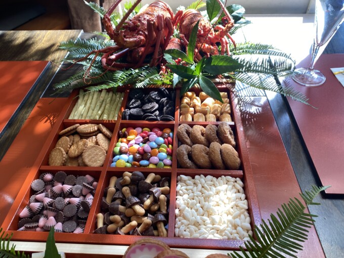 これちょっとしか入っていないように見えて、意外と深さがあるからたんまり入っていてフィオンは目の前に座ってメインはお菓子でお正月をお祝いしていたよ。そもそも5歳にはお節ってなかなか食べられるものがないしね。こういうのあるのほんとに助かるから、お父さんナイスアイディア!!
