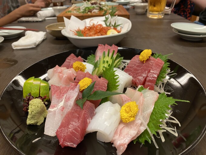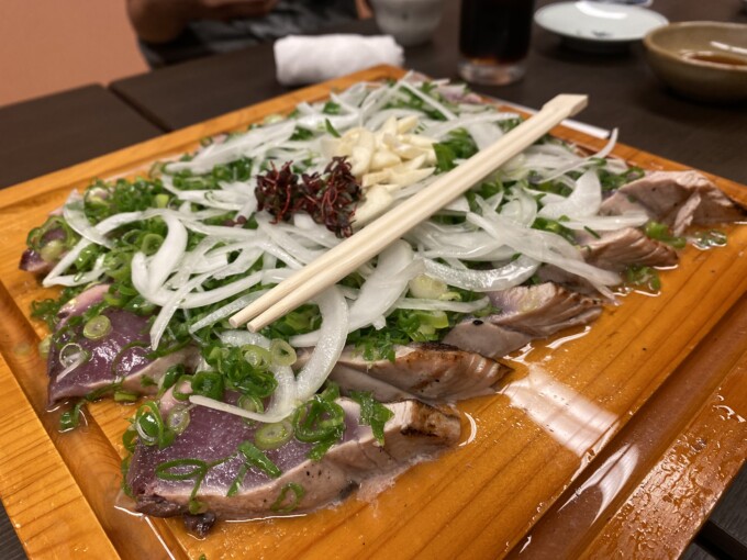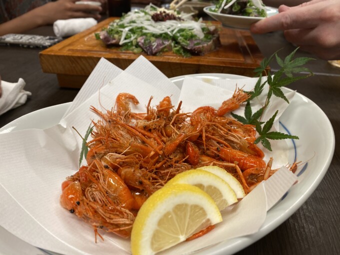 これでもか!ってほと塩たたき、タレたたき、お刺身盛合せ、青さのてんぷら、うつぼの天ぷら、川海老、土佐巻 etcとみんなで地のモノ食べまくったよ!住んでいても定期的に食べたくなるやつ!