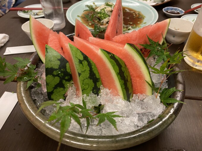 途中でお店からのサービスでスイカ頂いちゃったわよ!盛り付けもとっても素敵!こういうのさらっとできる技術とセンスがまじで欲しい。