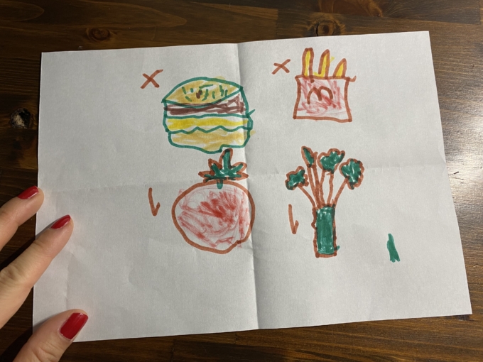 で、ある日この『ハンバーガーとポテトは食べちゃダメ!トマトとブロッコリーを食べましょう』