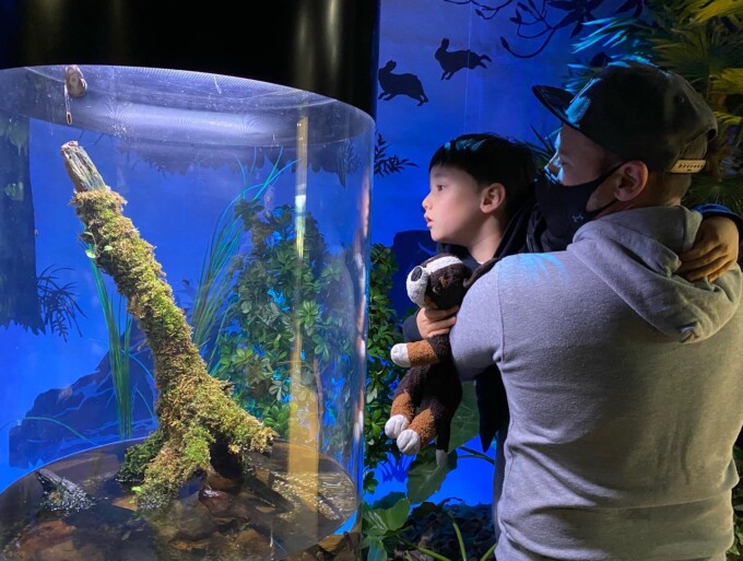 今日は少し成長を感じたことがあって、今まではそれぞれの生き物を見ても20秒がいいところでほぼスルー。ただ何度も何度もぐるぐる周るのがメインだったの。(多い日は5周したと思う)けど、今日は結構じっくり観察していろいろと自分の知識を披露してくれたり、質問をしたり今までとぜんぜん違ったのよ。