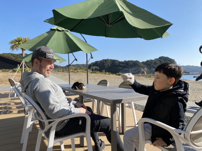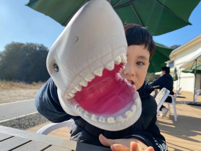 今日はまず1周したらSATOUMI内のカフェでブレイクするの予定だったんだけど、フィオンが行く前から食べたいって言っていたポテトが前の前の人で売り切れになっちゃってすんごい悲しんでいたので、その代わりどうしても欲しいって言っていたけどダメって一度断ってたシャークヘッドを買ってあげたよ。(かわいそうすぎてね)