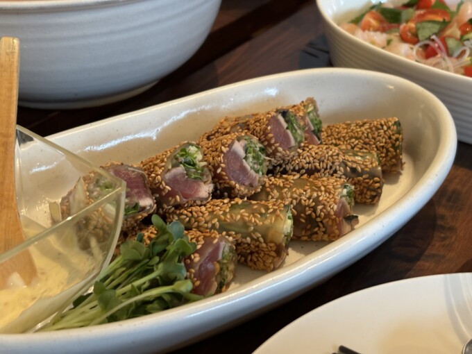 その中でとっても好評だったのがこのカツオのタタキを紫蘇やミョウガや揚げたにんにくチップと一緒にライスペーパーで巻いて胡麻つける変わり種生春巻き!わさびと胡麻入りのマヨネーズをつけて食べるんだけど超おいしいの!!