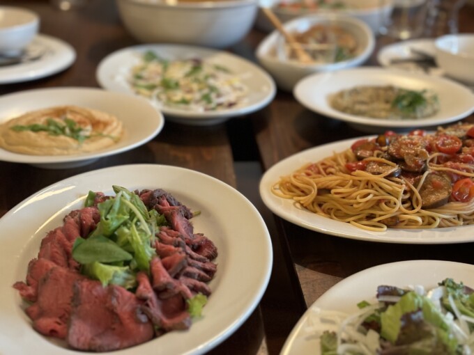 こども達も食べられるように夏野菜(お茄子とトマト)のパスタや、サラダやローストビーフ。