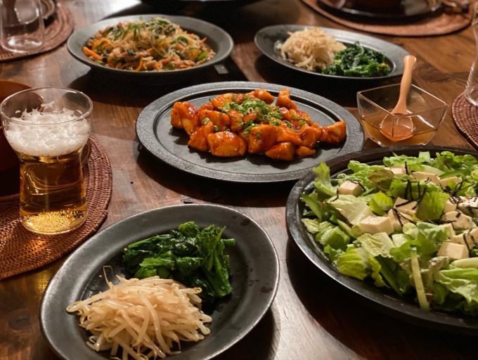 あとは、もやしと菜花のナムル、チョレギサラダ、ヤンニョムチキン、しらたきチャプチェ!