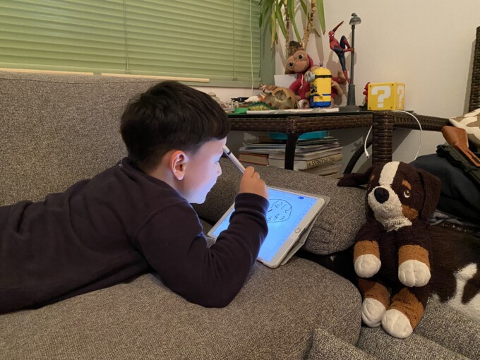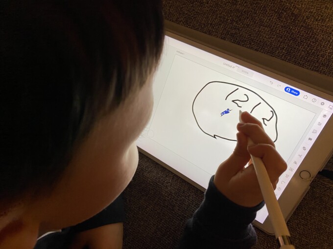 その機能をまだあまりきちんと把握していなかったんだけど、どうしてもちょっとしたイラストなので自分で描いてみようと思うお仕事があってリビングでそのチュートリアルをYouTubeで見ていたらさっそくフィオンも『ぼくもやりたい!!!!』って。