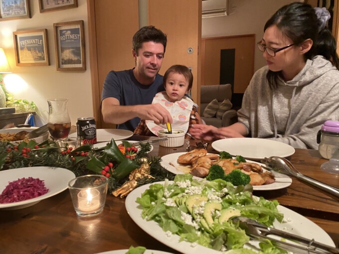 これは家族でしてクリスマスイブのクリスマスディナーの翌日、本当のクリスマスDayにマットとリナちゃん家族を招待してちいちゃなクリスマスディナーをしたの。ベトナム旅行から帰ってきたばかりでまだ落ち着いていなかったから一緒にやろう!って誘ったの。