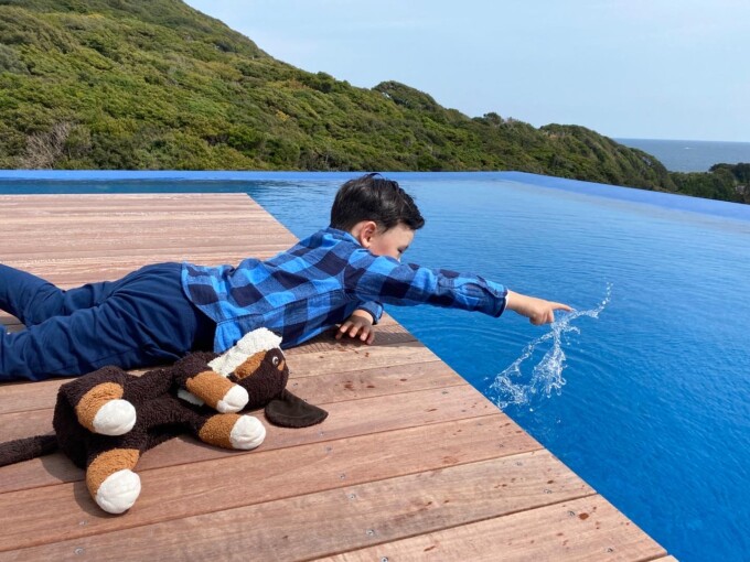 フィオンは勝手知ったる2回目だからデザート前にプール行こう!って