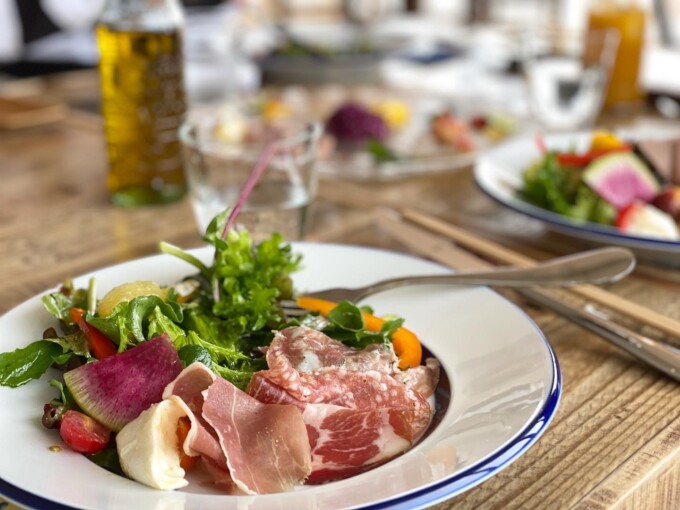 でまずはじめに来た前菜がこれ!地元のお野菜のサラダとプロシュートやチーズ。