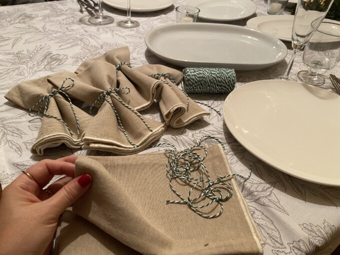 お買い物に出かけた夕方にまず実家に寄り道してお庭から拝借したヒイラギをナプキンと一緒にかざったよ!