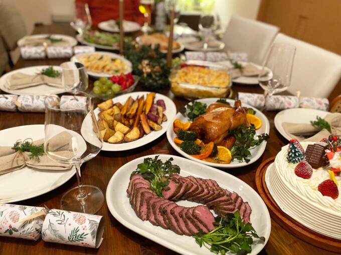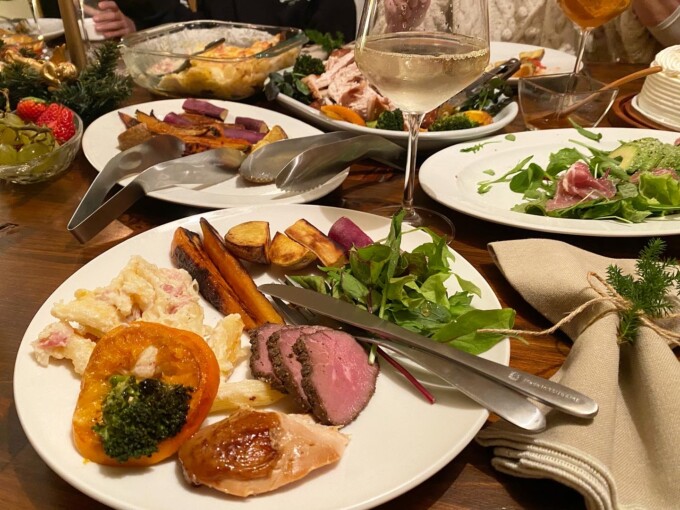 メニューはローストチキン・ローストビーフ・グラタン・サーモンパイ・野菜グリル・サラダ・パン・フルーツ。