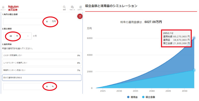 6万円を30年普通に貯めると(6万×12ヶ月×30年)=2,160万円 でもこの方法で投資すると運用金額は6,027万円 その差額(投資で得た利益)は、3,867万円!!