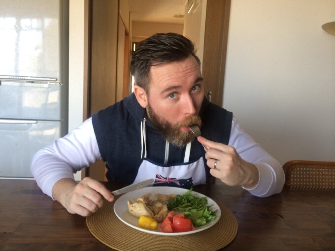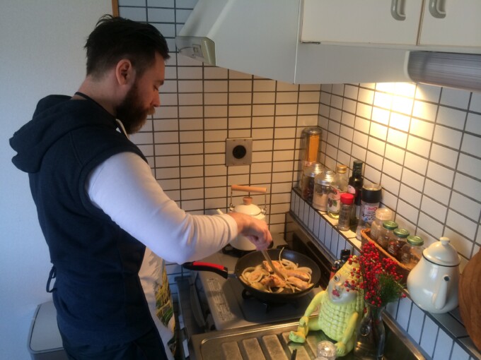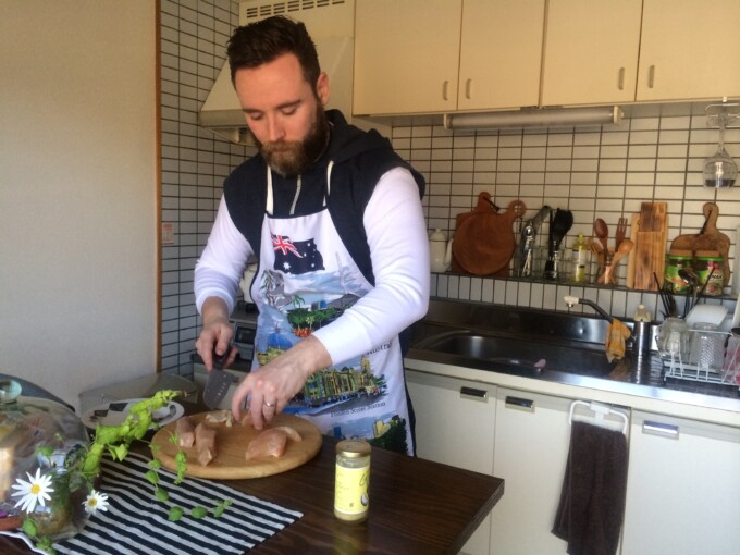 オーストラリアのエプロン(お友達からのお土産、当時けっこう気に入ってたやつ)してお料理してくれてる。