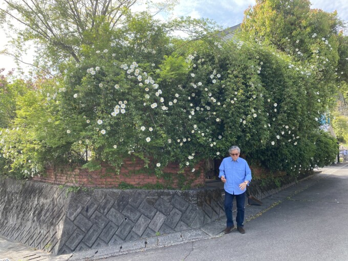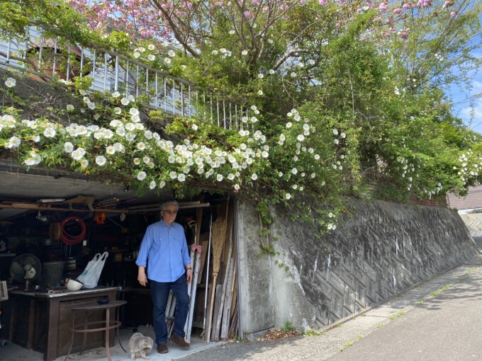 この車庫の上だけけっこう咲きまくってたけど門の方はまだもう少しだ満開な感じ。